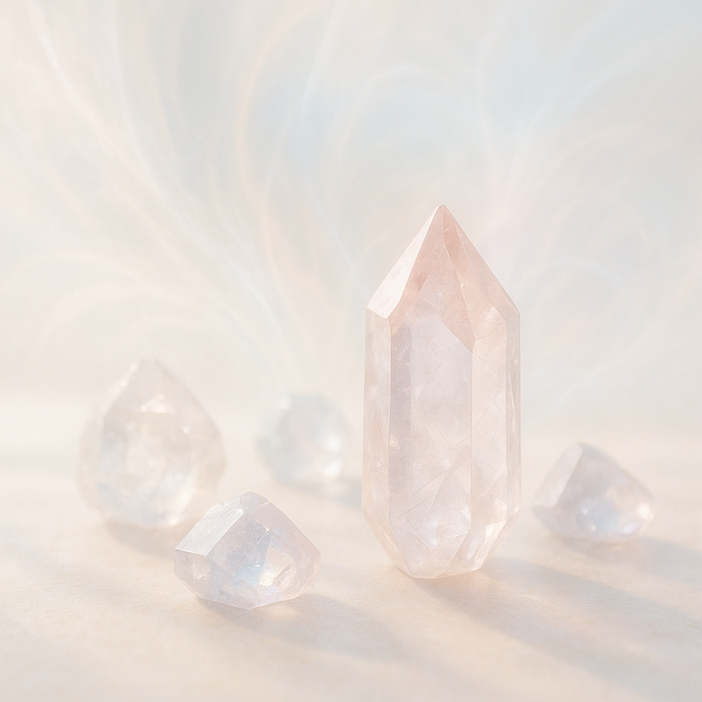 Усередині світла можна побачити прозорі грані, що розділяють і одночасно з’єднують. Вони нагадують нам про багатогранність наших почуттів — теплі, ніжні, іноді крихкі. Кристали ніби говорять: любов — це не одноманітність, а гра відтінків і глибин, що вкривають і оберігають.