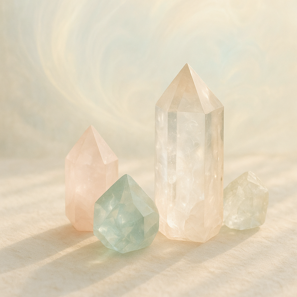 Іноді у тихому просторі, де дихаєш не поспішаючи, можна помітити, як світло, що живе в тобі, починає м’яко мерехтіти. Це світло — не зовнішнє, не викарбуване сонцем чи місяцем, а внутрішнє, тонке, як подих повітря між листям. Кристали — наче маленькі посередники між цим світлом і нашим тілом, між тим, що можна відчути, і тим, що часто лишається за межами слів. Вони не говорять, але мовчазно відчиняють двері до глибших озарінь.